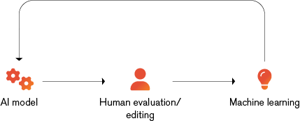 The diagram shows how human translators contribute to the AI translation process. Human input serves to validate the translation output that the AI model produces. Any rectifications or approval is fed back into the AI model for future application.