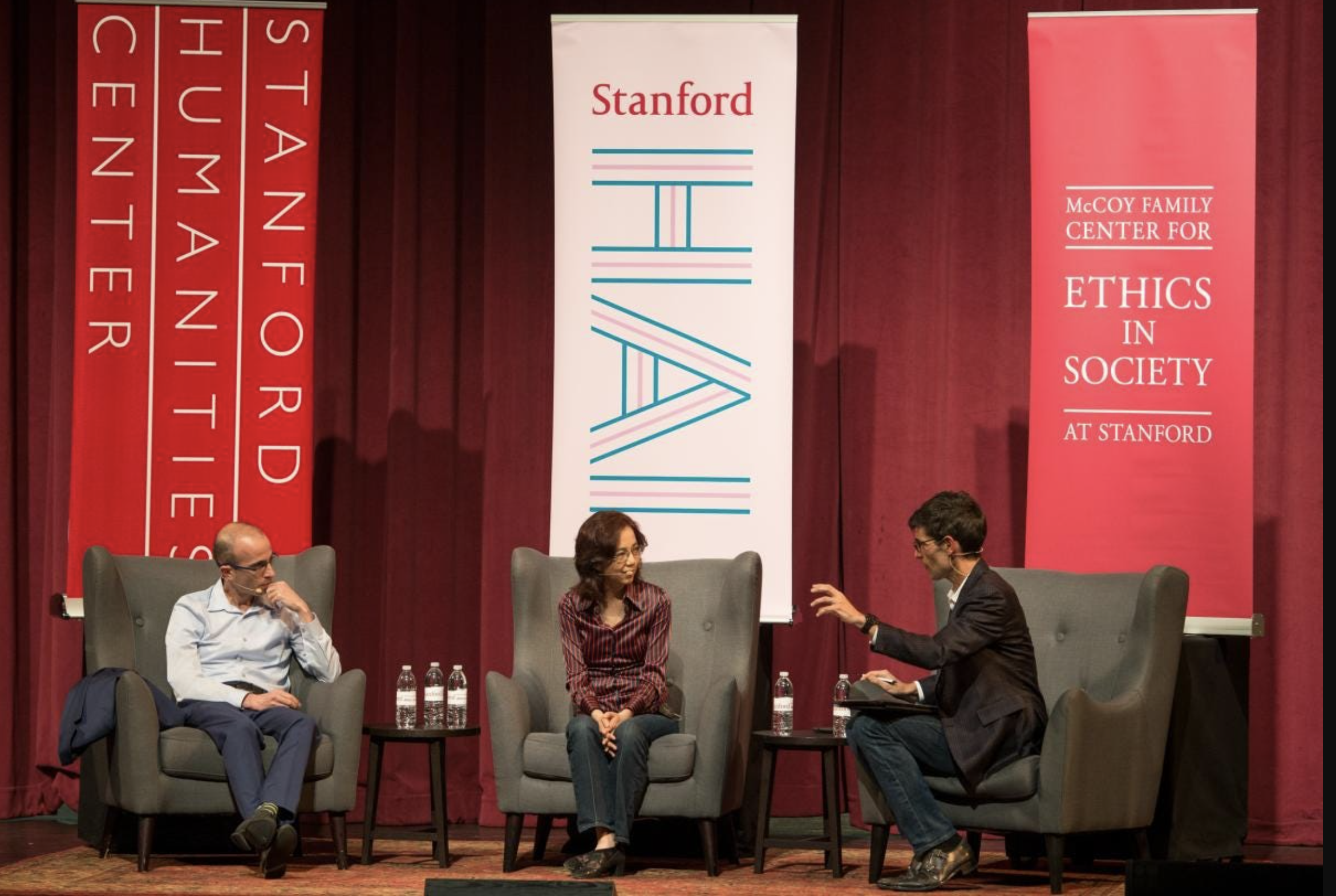 Let's examine what we can learn today from this image (Figure 1), which can be captured from a real-time video feed. The scene is a typical stage setting. For example, we'd like to generate situational meta-information about the three speakers, their clothing, and other relevant details to aid in the translation process. With appropriate prompting, a large language model such as GPT-4 combined with a vision system can provide the descriptions shown in Figure 2.